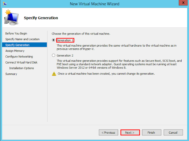 4. Pilih Generation 1 untuk memilih virtual machine yang mendukung perangkat keras sebagai lanjutan dari versi Hyper-V. Kemudian klik Next.